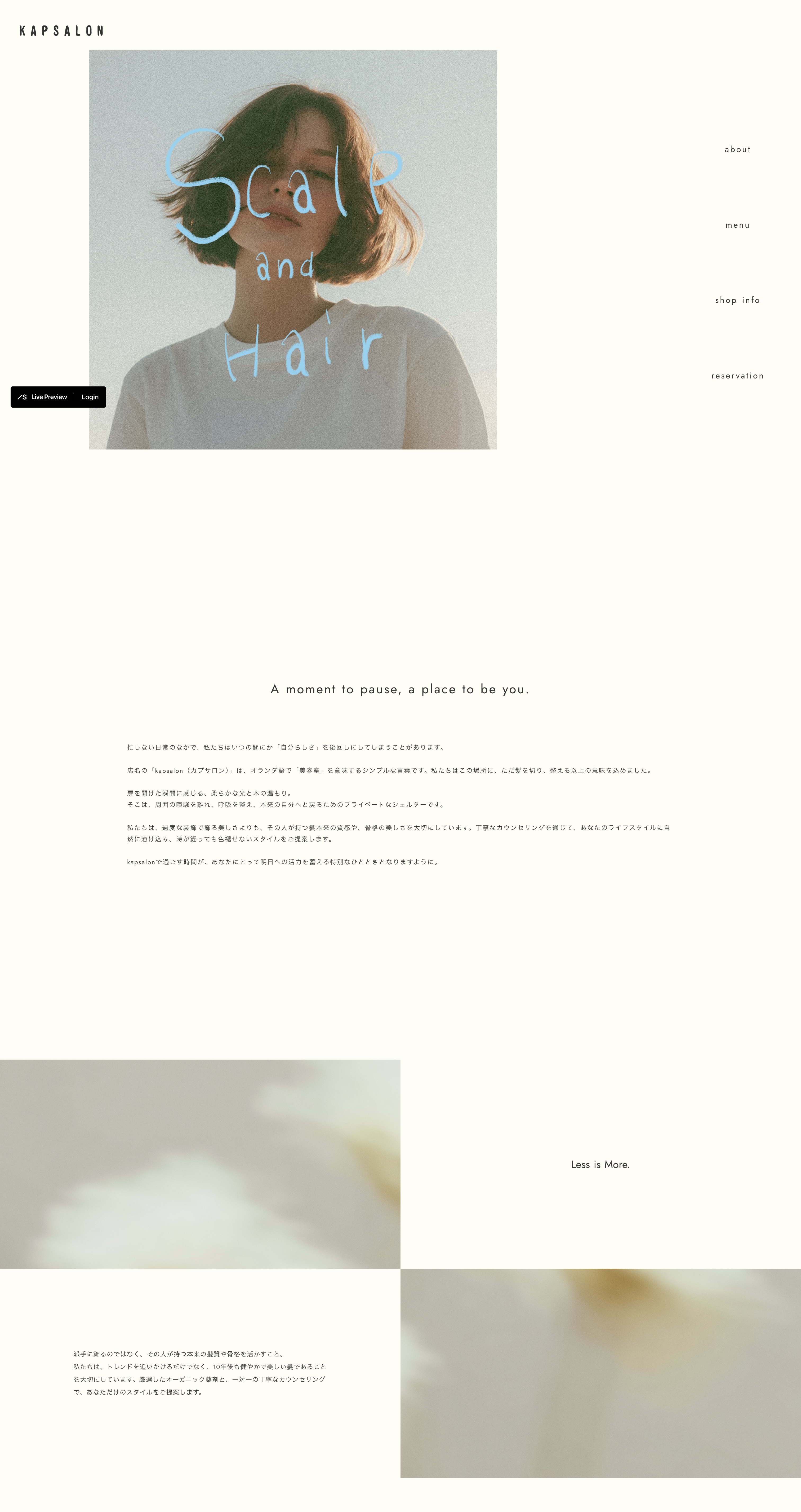 ヒーローセクションのデジタルアニメーションに始まり、ブランドの印象を視覚的に伝えるレイアウト。美容師さんやセラピストさんなど、空気感を大事にしたいブランドにおすすめ。